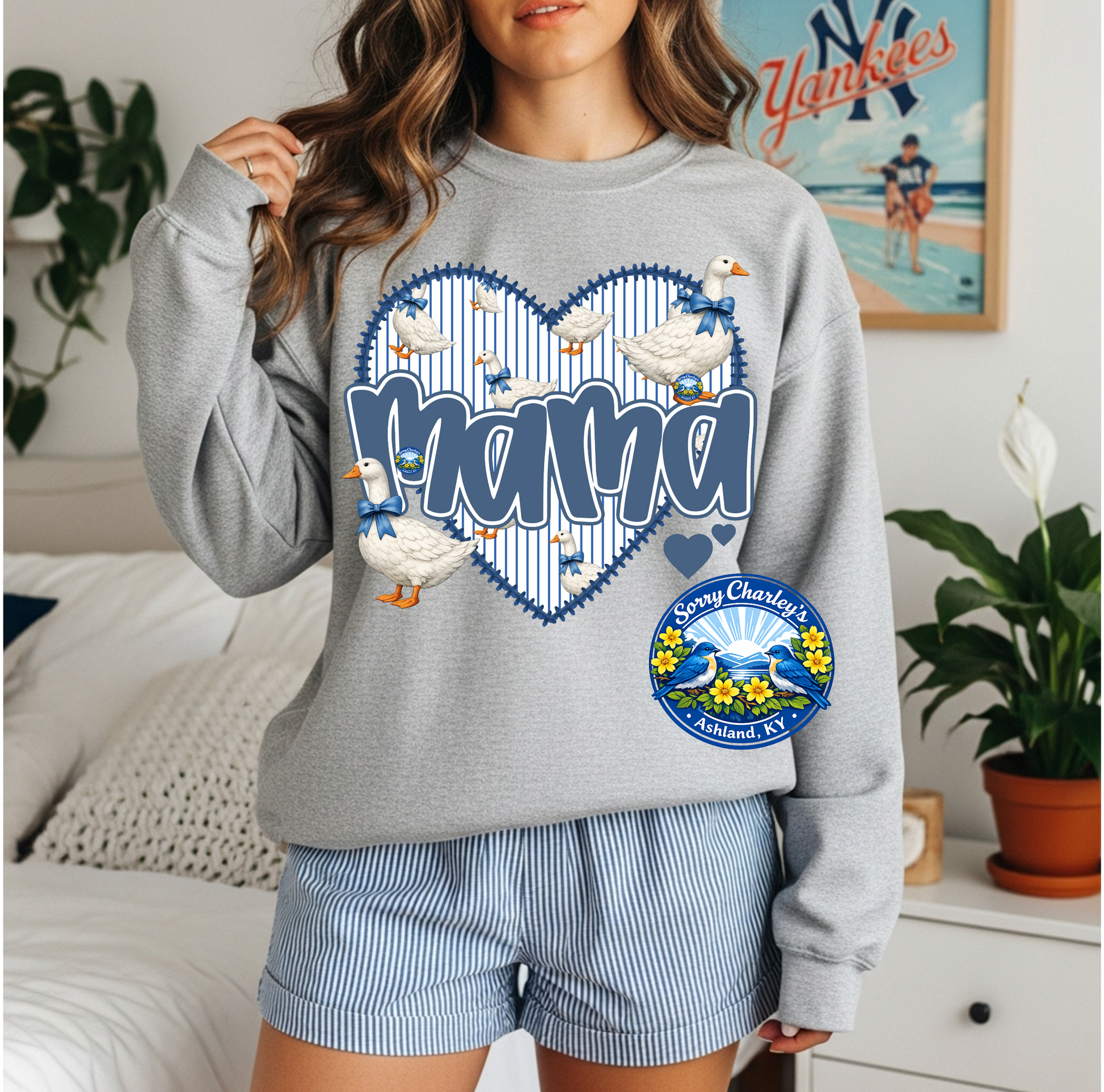 We have this design available in Mama, Nana and Mimi! Graphic is printed on your choice of a Comfort Colors tee (Baby Blue or Gray) or a Crewneck Sweatshirt (Baby Blue or Gray). All are unisex sizing and fit true to size. Please allow up to 5-7 business days for processing. If additional sizes or a rush order is needed please email amanda@sorrycharleys.com