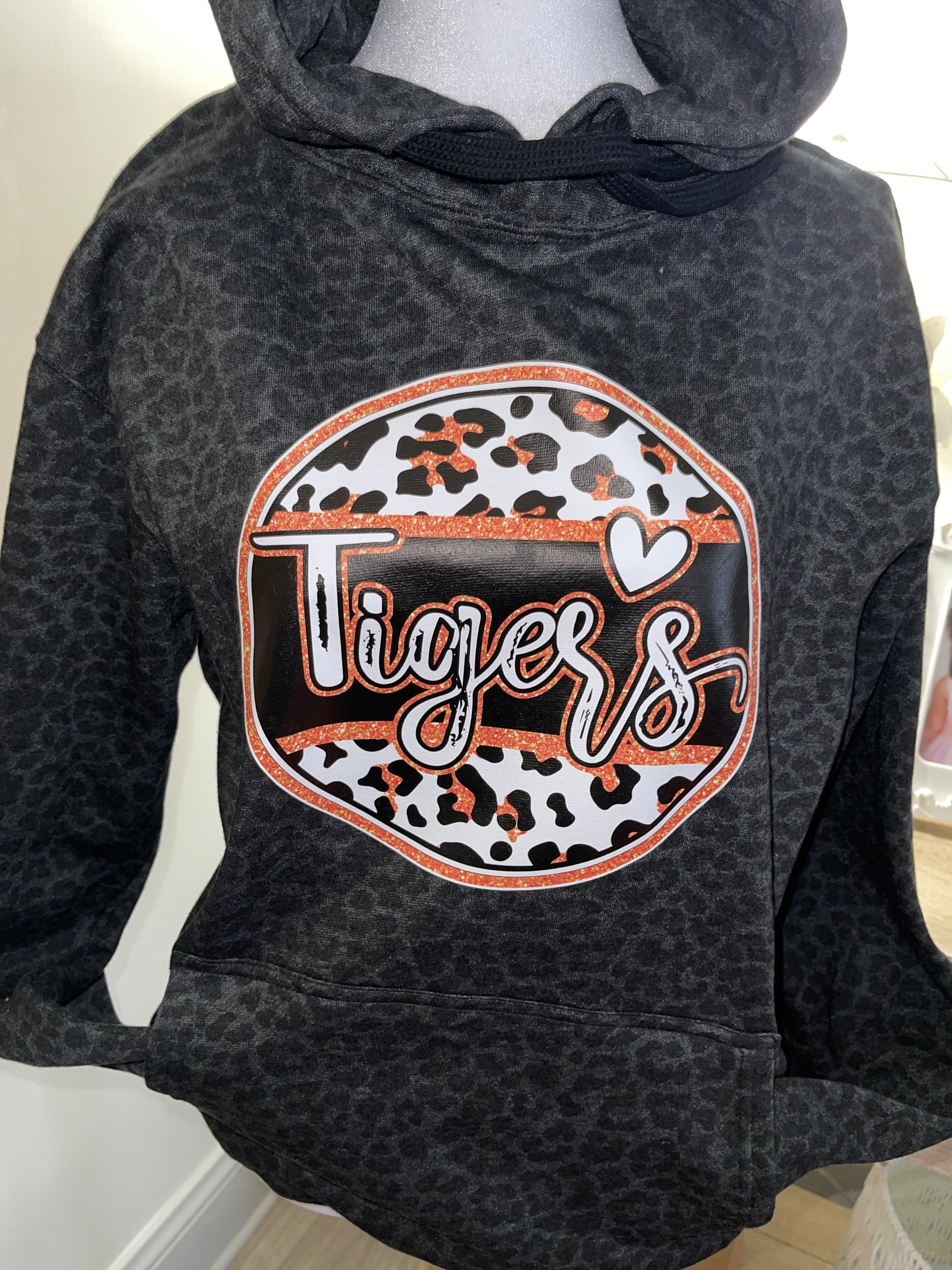 Leopard hoodie with your choice of mascot graphic! We can do this design for any mascot or school colors!